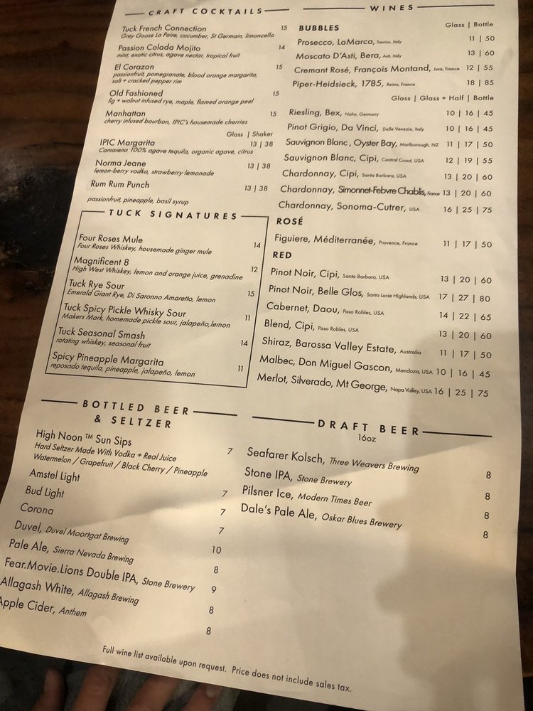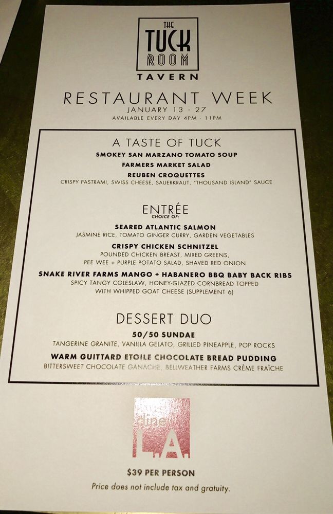 Introducing The Tuck Room, a trendy and upscale New American Breakfast & Brunch spot located in Los Angeles. This restaurant offers a variety of utilities such as reservations, takeout, delivery, and valet parking. With limited vegetarian options, The Tuck Room caters to a diverse range of customers, including those who prefer gender-neutral restrooms and dog-friendly outdoor seating. The menu features mouth-watering dishes like the Boss Burger, Crab Cake Sandwich, and Short Rib Grilled Cheese, as well as starters like Brussels Sprouts and Chicken Wings. Make sure to try the Charred Tomato Salad or Chicken Caesar for a refreshing salad option. Overall, The Tuck Room promises a great dining experience with its eclectic menu, trendy ambiance, and excellent service.